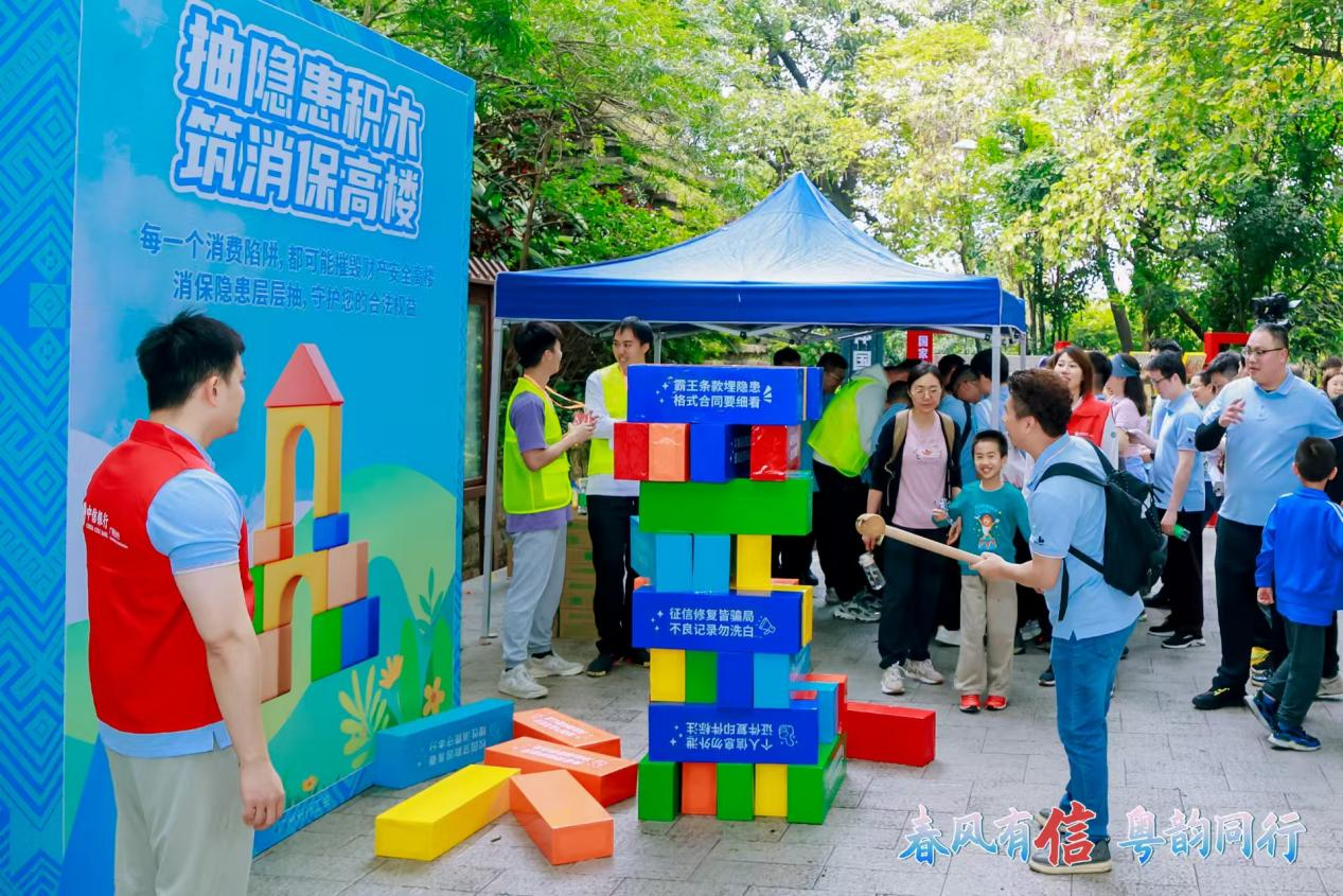 在綠意盎然的公園步道旁,中信銀行廣州分行特別設(shè)置“抽隱患積木 筑消保高樓”游戲體驗區(qū),把金融教育課堂搬進公園里?,F(xiàn)場搭建的2米高積木塔暗藏玄機,每塊彩色積木均印有“高收益理財陷阱”“虛假網(wǎng)絡(luò)借貸”“非法代理維權(quán)”等各類典型消費風險案例,如“高息理財是陷阱,保本承諾別輕信”、“陌生來電假客服,轉(zhuǎn)賬匯款先核實”、“金融產(chǎn)品風險分,風險測評要認真”等。參與者需逐層抽出標注風險的積木,在保持塔體平衡的同時,由銀行志愿者同步解讀對應(yīng)風險特征及防范技巧。